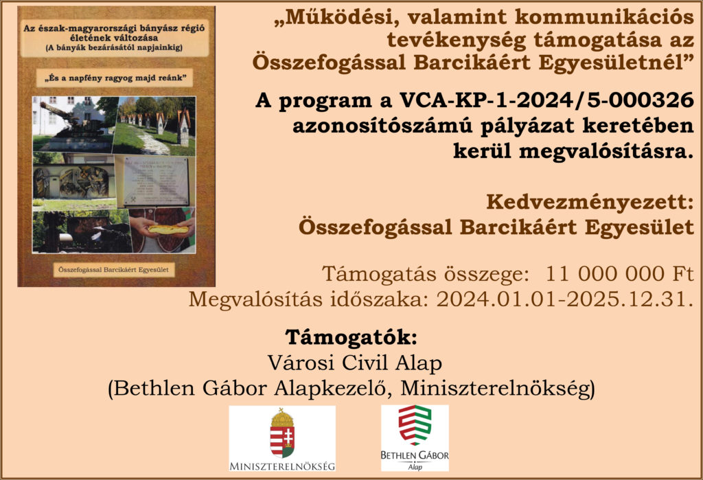 Az Összefogással Barcikáért Egyesület a vidéki térség településeinek életét rendszeresen az olvasók elé tárja. Az elmúlt évben egy könyv kiadására is vállalkoztak “Az észak-magyarországi bányász régió életének változása-A bányák bezárásától napjainkig-címmel.